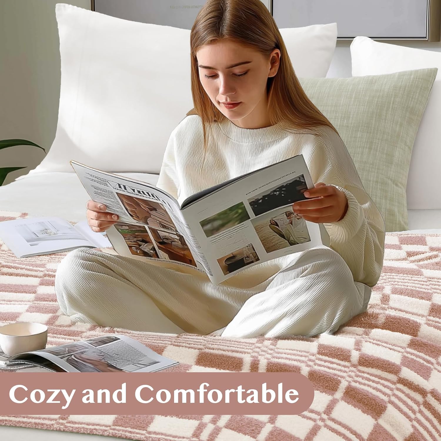 WRENSONGE Checkered Throw Blanket, Clay Pink Soft Cozy Fluffy Warm Hand Made Throw Blankets for Couch, Sofa, Chair, Bed, Camping, Picnic, Travel Lightweight Bed Blanket - 50"*60"