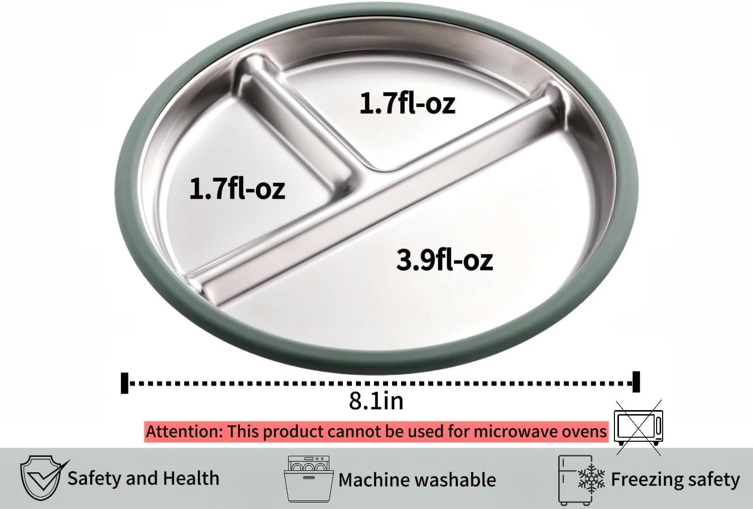 - 【Designed for Kids】This baby plate with suction combines durable 18/8 stainless steel with a Food-grade siliconesilicone suction base featuring 4 strong non-slip suction cups. Keeps plates in place on highchair trays or any flat surface for an extra secure grip that won’t budge, helping your child self-feed and minimizing mealtime mess. Say goodbye to flipped toddler plates and hello to free hands for mom!