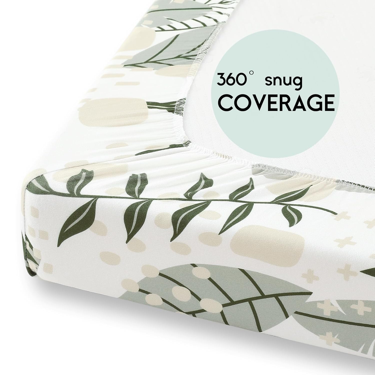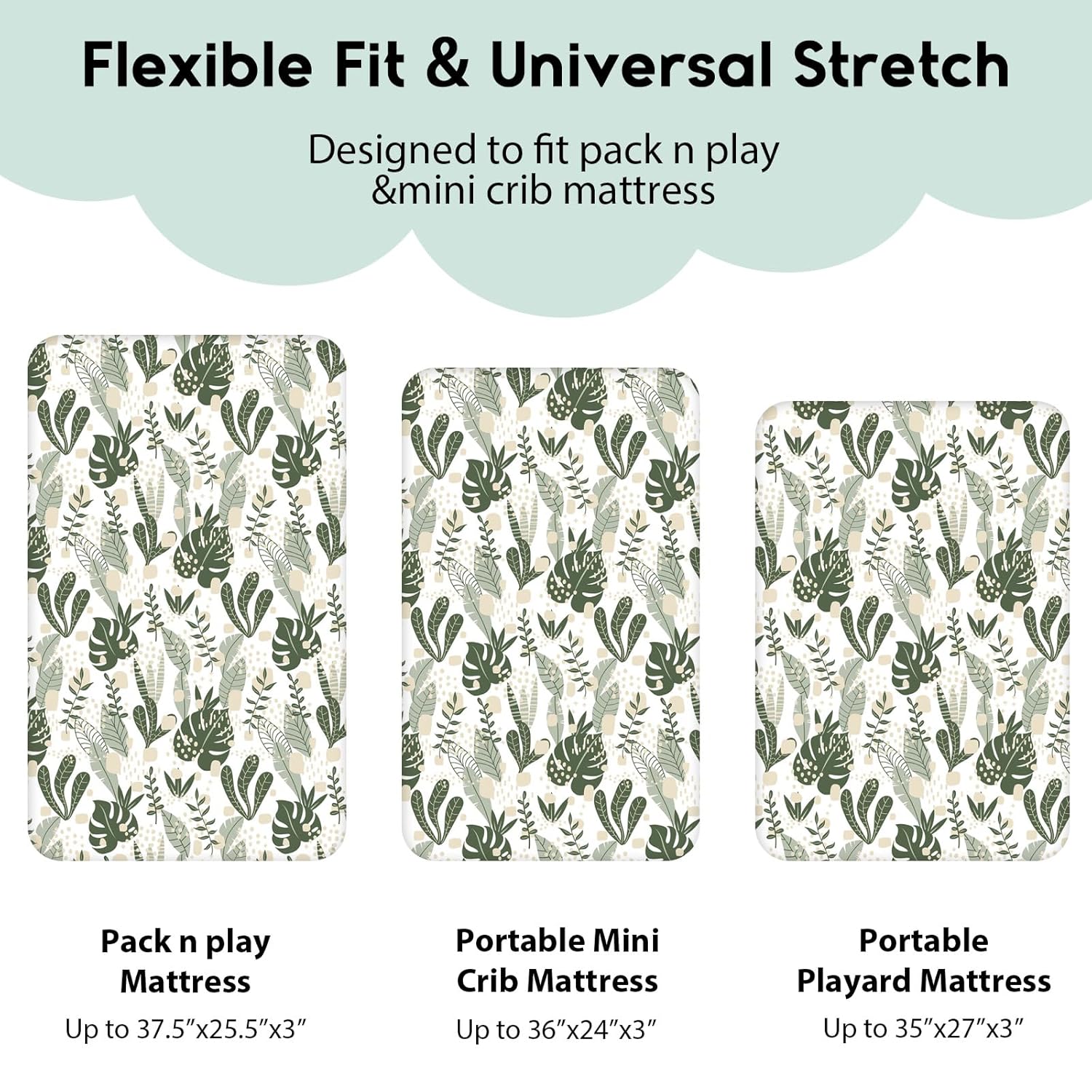 Yoofoss Pack and Play Sheets Fitted, Mini Crib Sheets 2-Pack for Pack N Play Mattress, Stretchy Playard Sheet, Soft and Breathable (Green + Banana Leaves)