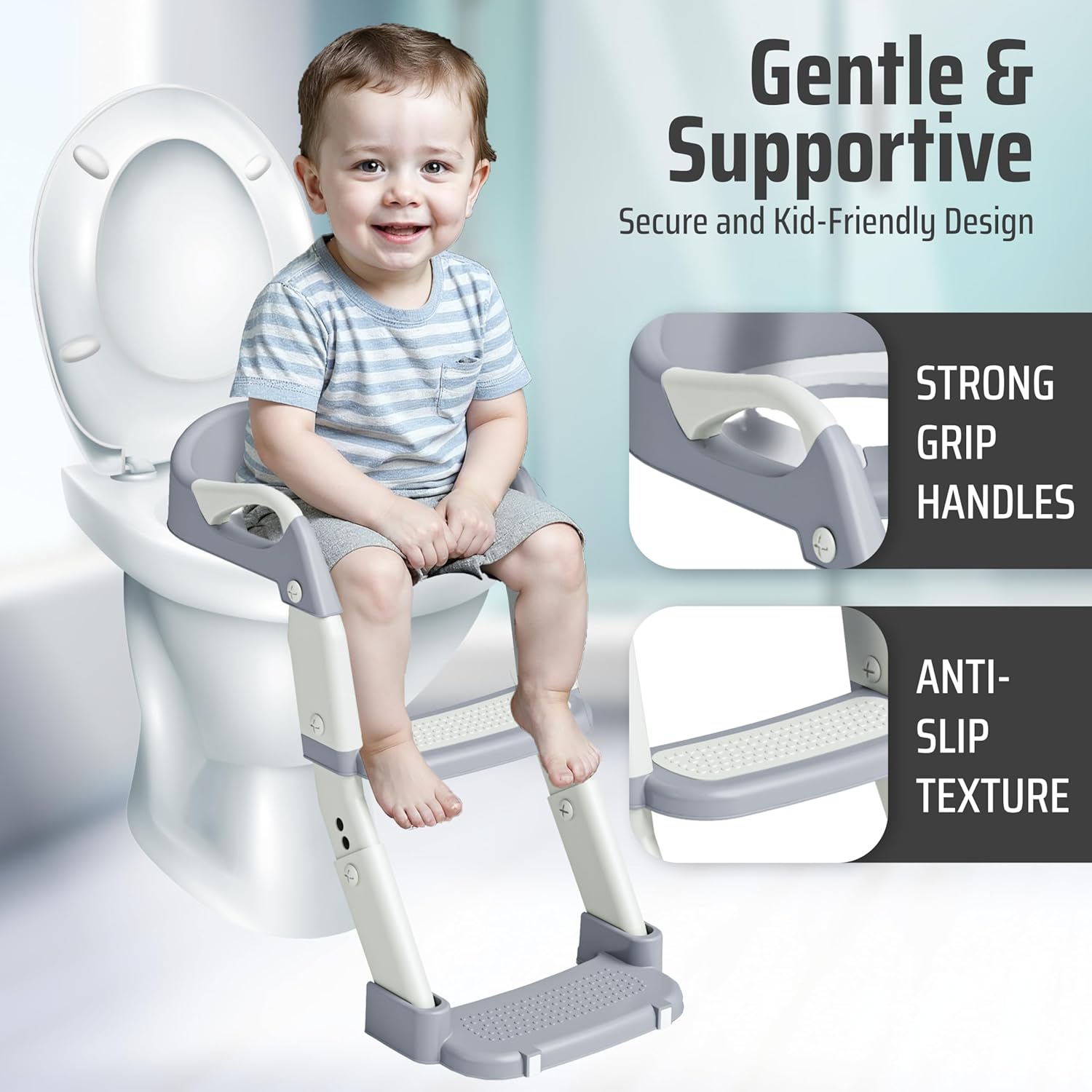 - ππππππ & ππππ-π πππ: No more sliding or shifting! With 11 total anti-slip contact points 6 on the ladder base and 5 under the seat, this potty training toilet seat offers unmatched stability. Itβs built with extra grip to keep things steady and stress-free for parents and child. The high-grip rubber of toddler potty training toilet material prevents shifting or sliding, giving your child secure footing and giving you complete peace of mind during every potty break.
