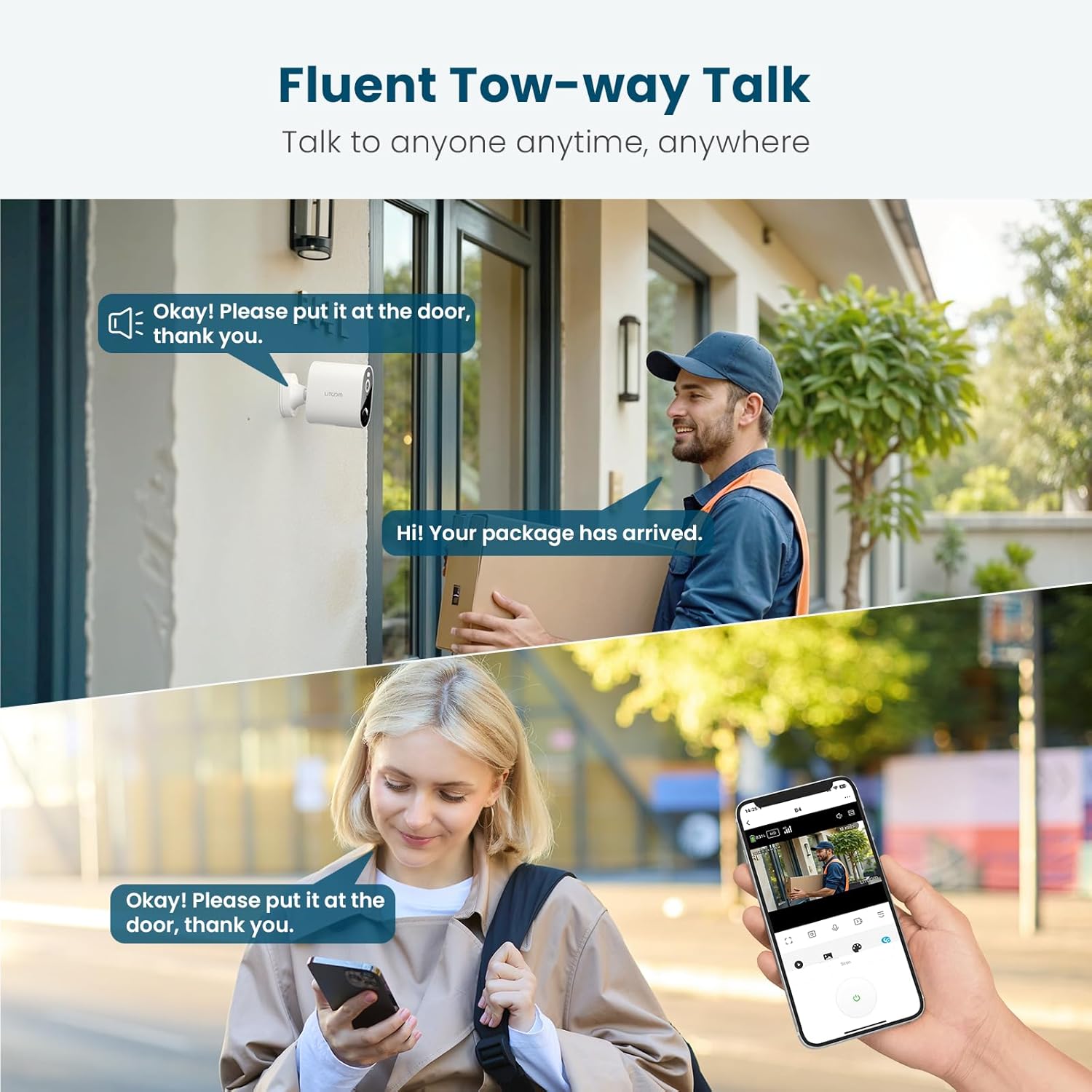 - 【Two-Way Talk & Smart Siren Alarm】The home security cameras wireless outdoor has a built-in microphone and speaker that supports real-time, two-way talk. Via the mobilee App, you can warn off thieves, screen visitors at your door or communicate directly with your family or friends. The wireless home security cameras's Siren alarm, flashing led light or 2-way talk that both allow you to drive away thieves and unwanted visitors.