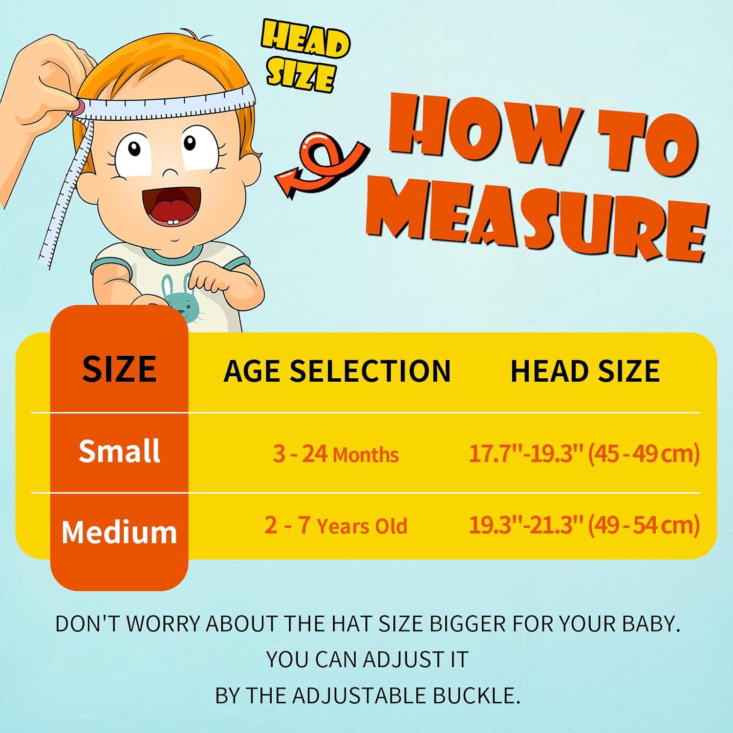 • ADJUSTABLE TO GROW WITH KIDS: Sun hat for kids has two sizes: Size S: 3-24 months fits head circumference 17.7"-19.3"; Size M: 2-7 years fits head circumference 19.3"-21.3". The stretchy headband and rope buckle behind the sunshade hat can adjust the head circumference for a comfort fit. Great for your toddler boy or toddler girl, and big kids too! So, this durable infant hat will definitely grow with your kids for a long time