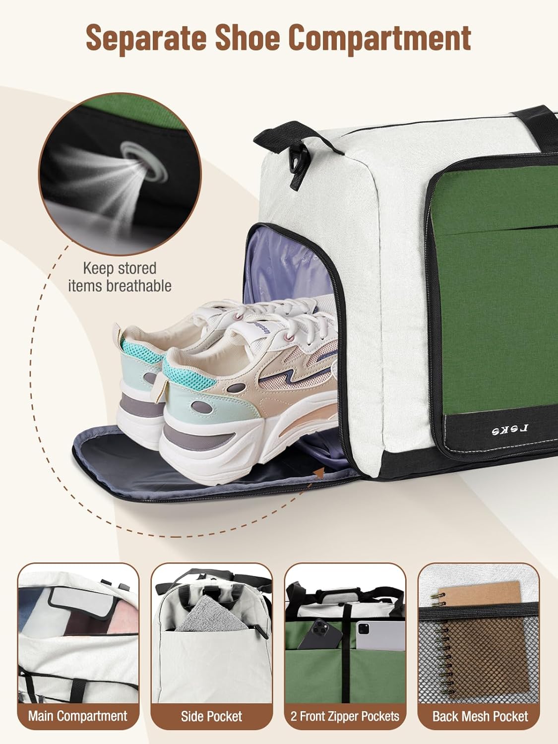 Lekesky Foldable Travel Duffle Bag for Women, Large Duffel Bag with Separate Shoes Compartments & Straps, Carry On Weekend Bag for Women, Hospital, Overnight (Green & Camel, 80L)