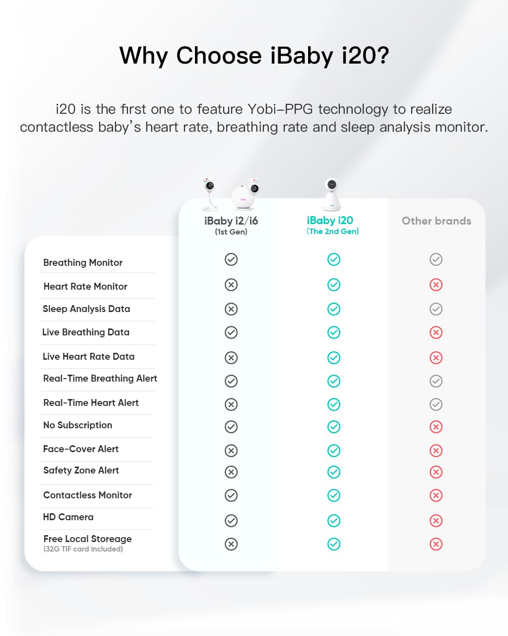 iBaby i20 Smart Baby Monitor - Monitor Newborn Heart Rate, Breathing, Sleep Pattern, Sound Machine, Cry & Safety Alerts, 1080P Night Vision, Non-Wearable, No Subscription (Wall Mount + Cover Cable)