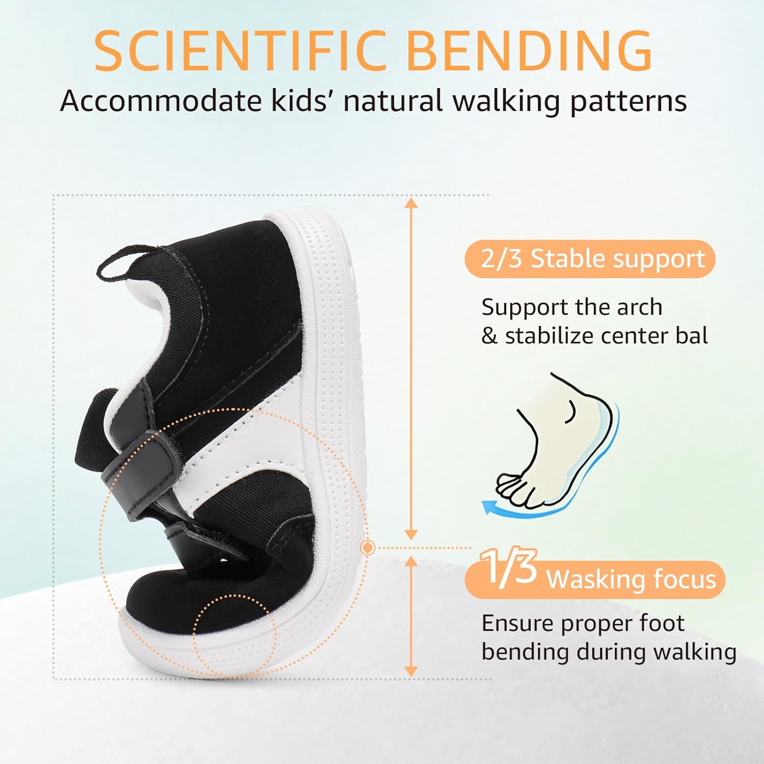 - [ Non-Slip Outsole ]: The treaded sole of these toddler first walking shoes offers excellent grip to help prevent slips and keep kids safe during play. The flexible 1/3 groove supports natural foot movement, perfect for active steps