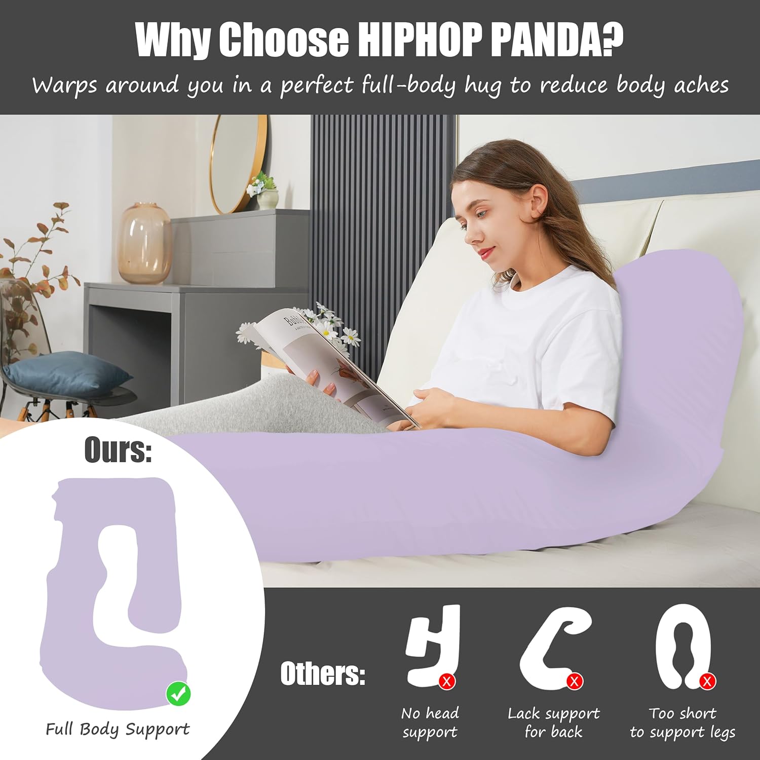 HIPHOP PANDA U-Shaped Pregnancy Pillow for Sleeping - Full Body Maternity Support Pillow with Removable Cover - Comfort for Back, HIPS, Legs, Belly - 57 Inch for Pregnant Women, Purple