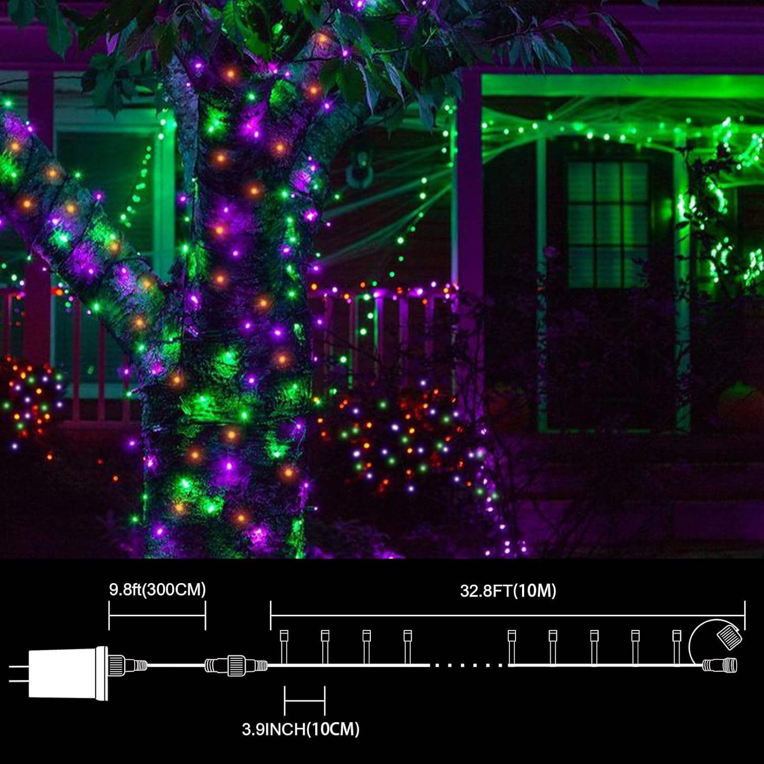 - Halloween Decorations String Lights: 33FT Christmas string lights with 100 purple ,Green ,Orange LED bulbs. Each Christmas lights has end-to-end connection, you can connect up to 8 sets together to illuminate a wider range.