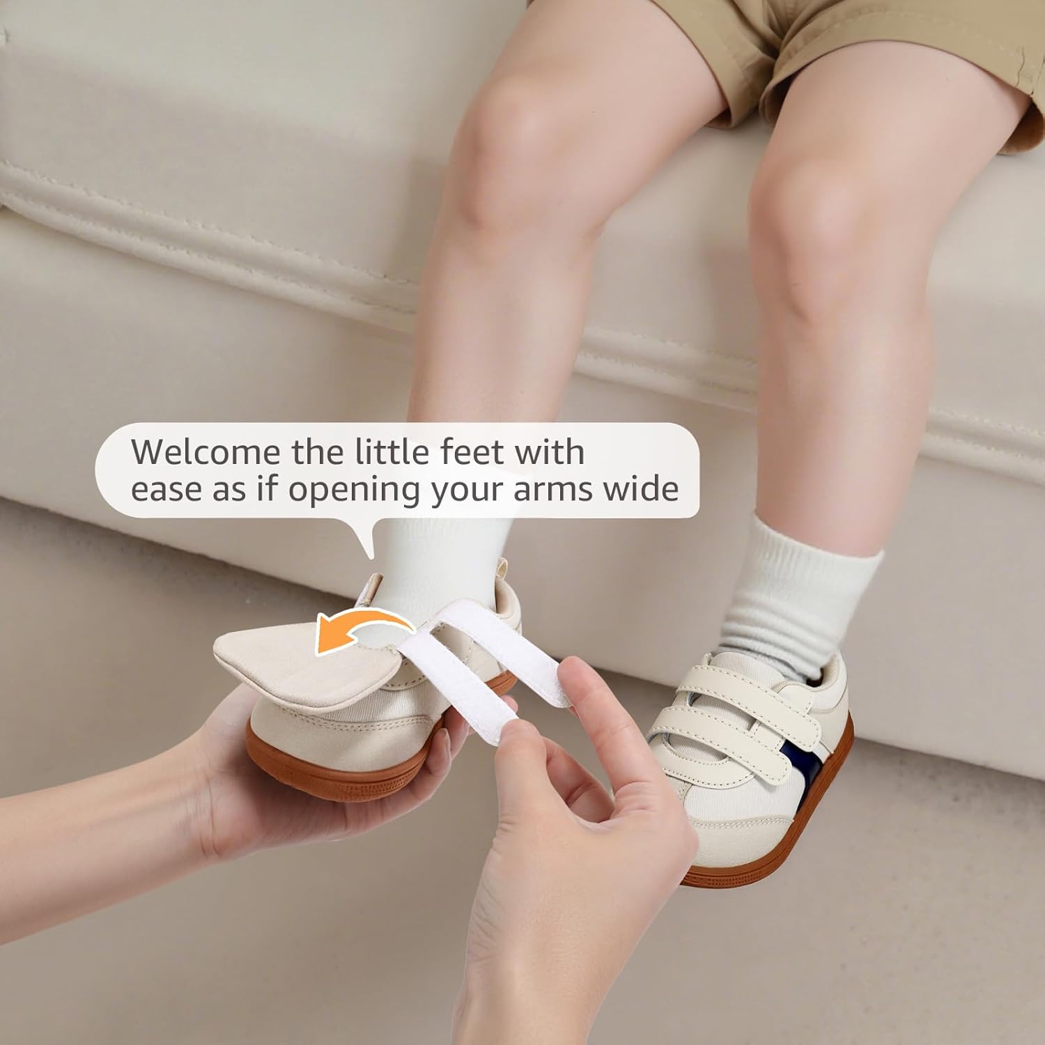 - [ Non-Slip Outsole ]: The treaded sole of these toddler first walking shoes offers excellent grip to help prevent slips and keep kids safe during play. The flexible 1/3 groove supports natural foot movement, perfect for active steps